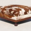 Each of our cowhide ottomans are completely custom to fit your décor. You can pick the color and pattern of the cowhide, the stain of the wood trim and legs, and the finish of the accent nail head. All can be made to any size to fit your space.